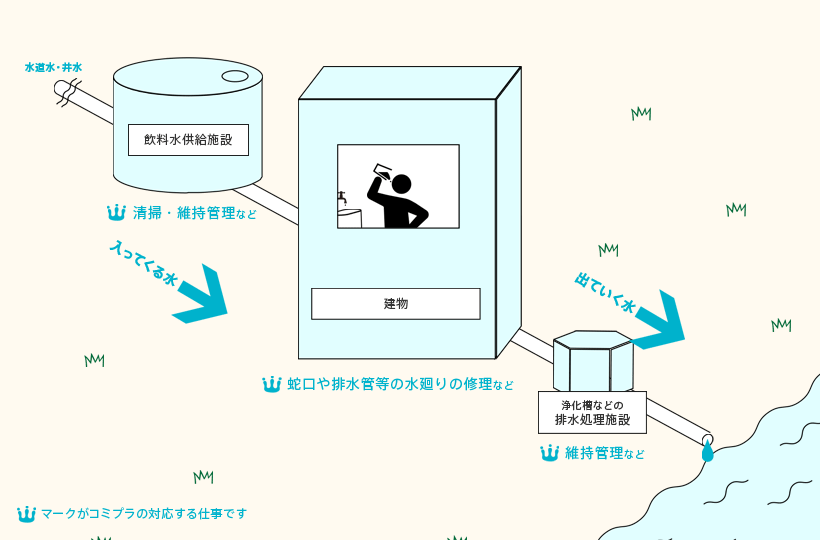 蛇口をひねればキレイな水がでる。その当たり前をつくるために、飲料水供給施設の維持管理、貯水槽を清潔に保つための清掃等を手がけています。